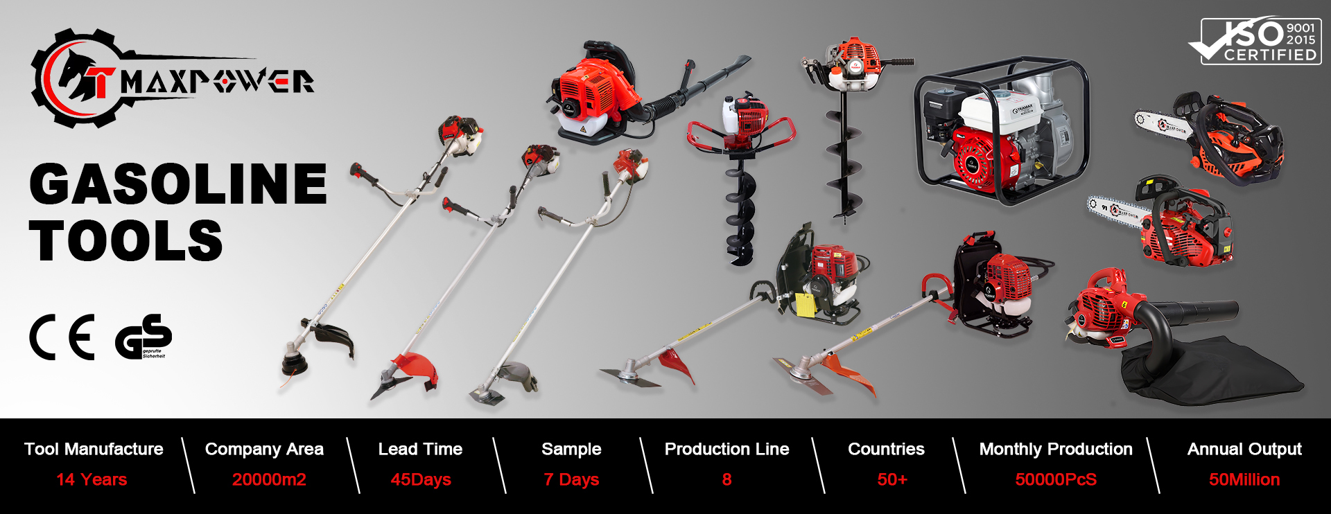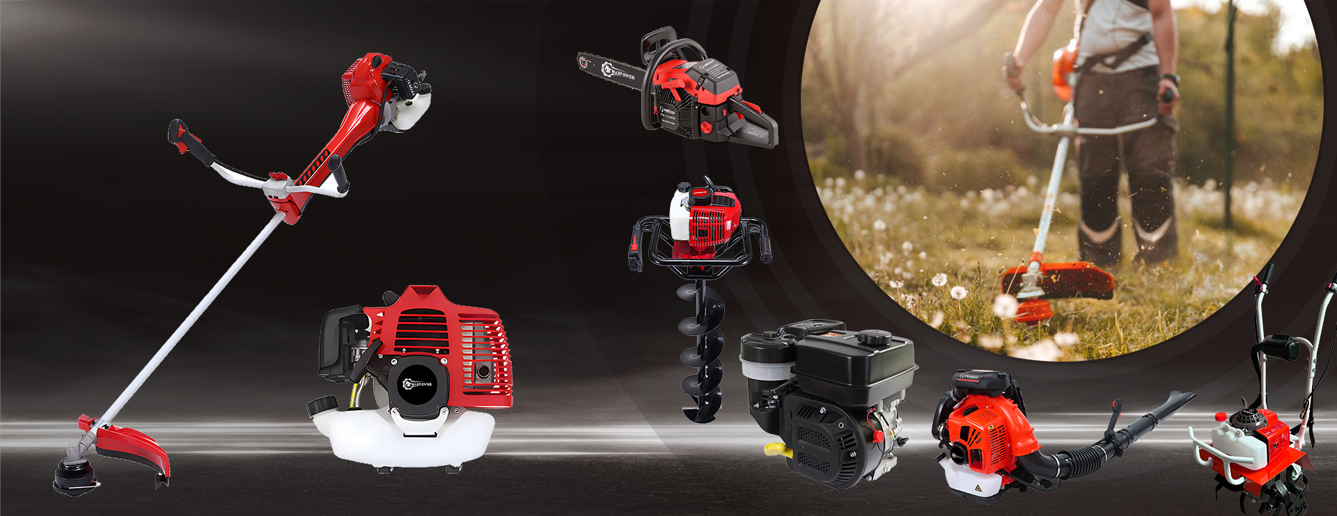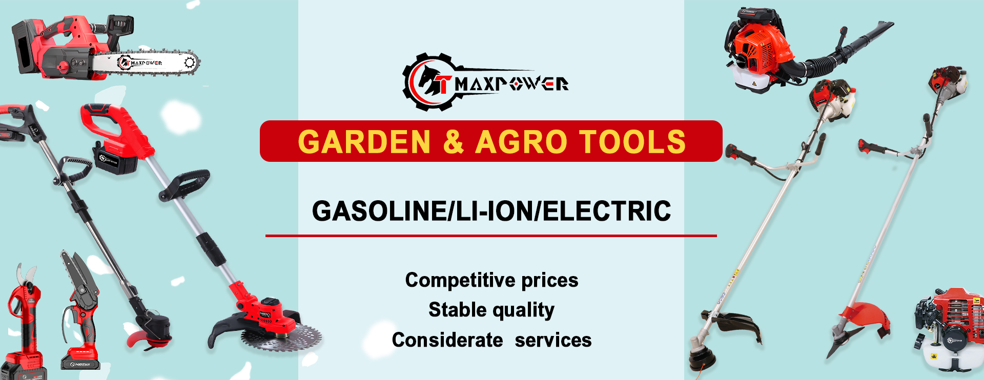 Our extensive product range includes gasoline outdoor tools such as Brush cutter,Chain saw,Earth auger, Lawn mower,Hedge trimmer, Leaf blower,Power sprayer ,Water pump and Mini tiller. And Li-ion battery tools such as Grass trimmer, Chainsaw,Pruning scissors,Hedge trimmer and Blowers